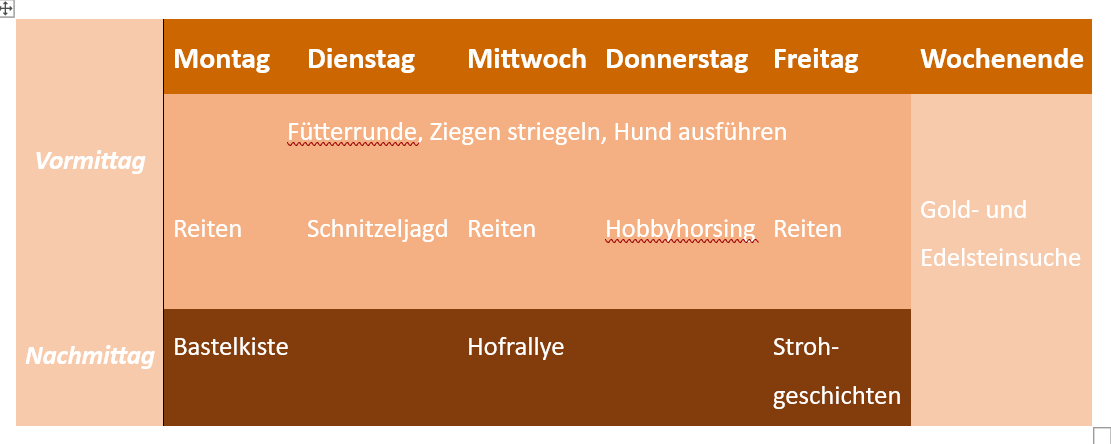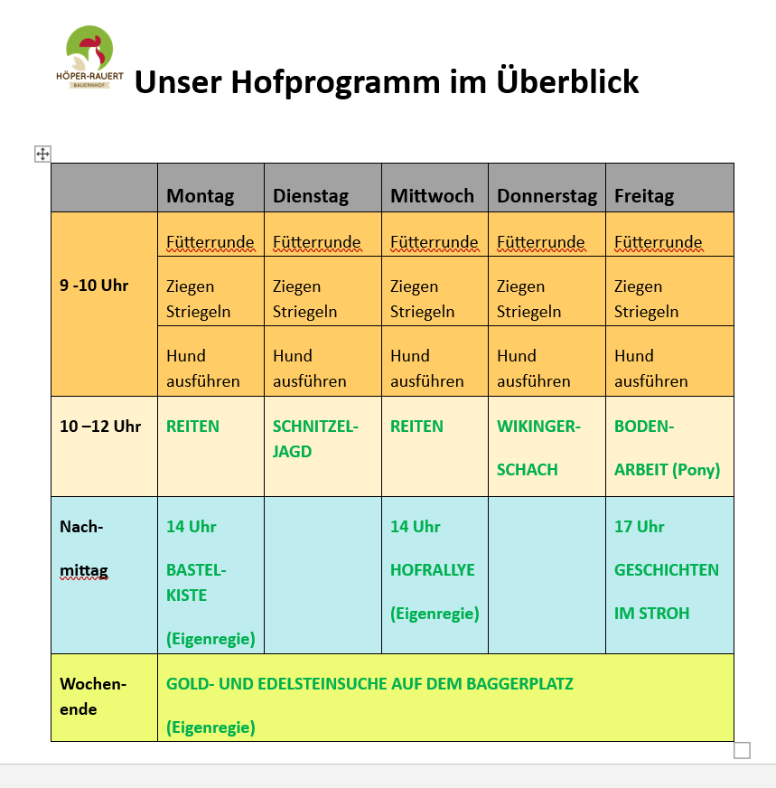 Leuchtende Kinderaugen garantiert! Ob gemeinsame Fütterrunden, Schatzsuchen, Reiten, Strohgeschichten - es ist für jeden was dabei. Gemeinsam mit der Bäuerin erleben unsere kleinen Gäste Mo-Fr spannende Vormittage und Mo,Mi, Fr aktive Nachmittage auf dem Bauernhof. So lernen sie das Hofleben und unsere lieben tierischen Mitbewohner kennen und haben Spaß und jede Menge Bewegung an der frischen Luft.
