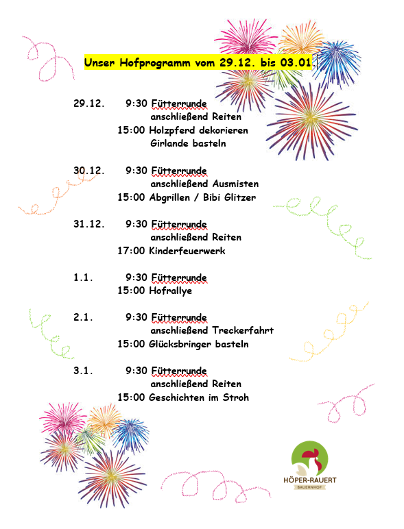 Bei uns auf dem Bauernhof ist immer was los. Sollten Sie Ihren Urlaub bei uns im Zeitraum von November-Februar planen, sprechen wir gern ein persönliches Programm mit Ihnen ab. Es kommt jeder auf seine Kosten.